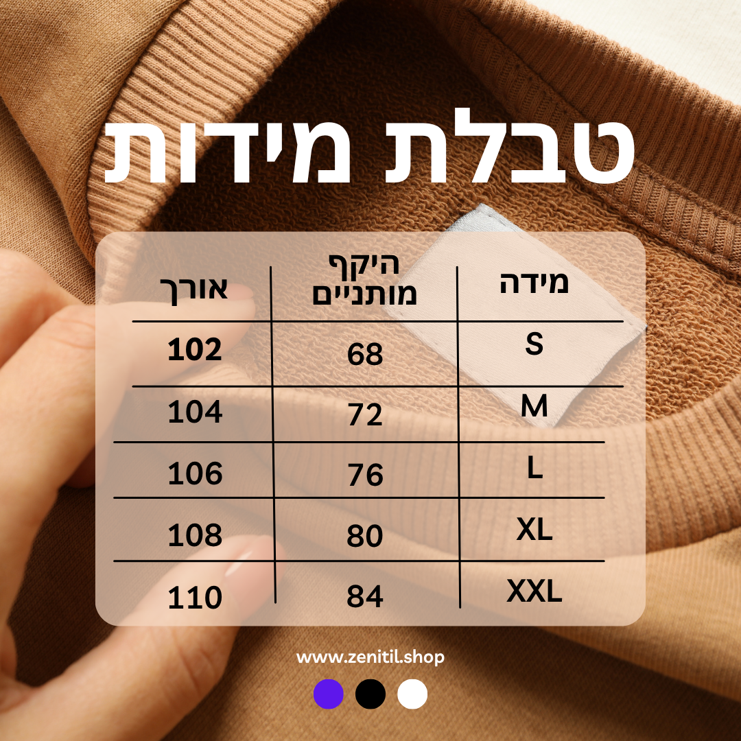 המידה שלך מופיעה בטבלת המידות שבסוף התמונה האחרונה, שם תוכל למצוא את כל המדדים לכל פריט. אנו ממליצים למדוד את עצמך ולהשוות את המידות כדי למצוא את ההתאמה המושלמת.